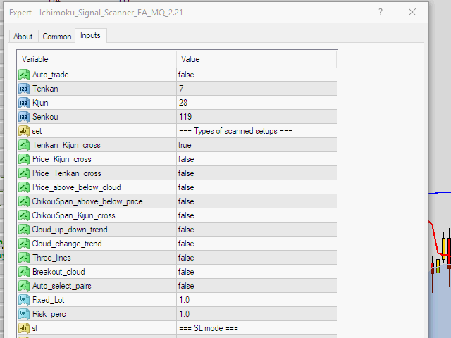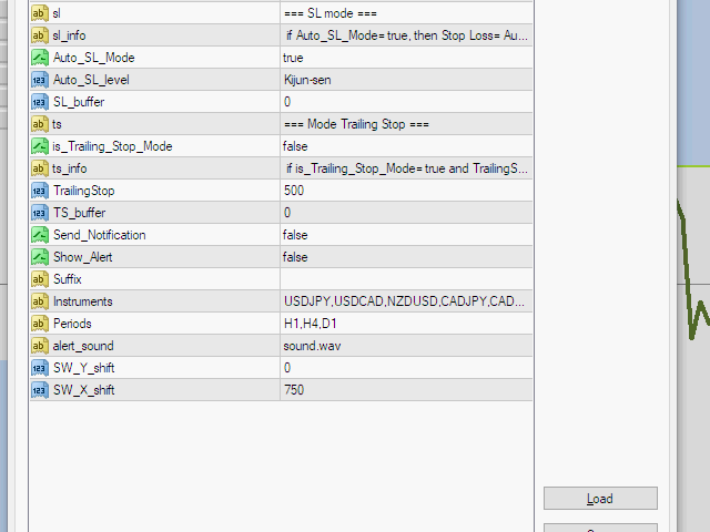 I added the function of automatic setting of Stop Loss in Auto_trade mode.Stop loss can be set in relation to the connection of one of four lines:-Kijun-sen,-Tenkan-sen,-Senkou span A,-Senkou span B.
