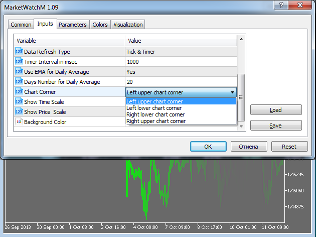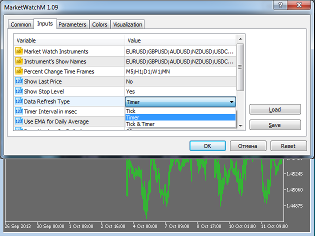 - Data Refresh Type - mode of updating the information on the screen. The following modes are available - Tick / Timer / Tick & Timer . In Tick & Timer mode the information is updated at every tick of the instrument and according to a set time interval. 5).
