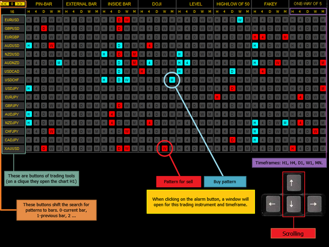 This panel is designed for quick visual search for the price action patterns on several instruments simultaneously. It is possible to add and remove instruments. Clicking the signal button allows you to quickly move to the chart with the identified pattern and timeframe. The panel searches for 8 candlestick patterns: PIN-BAR, EXTERNAL BAR, INSIDE BAR, DOJI, LEVEL, HIGH/LOW OF N BAR, FAKEY, ONE-WAY N BAR. Any of the patterns can be disabled by clicking its title. It can also search in history (by previous bars) with the buttons "<<" and ">>", as well as send push notifications at periods H1, H4, D1, W1, MN. For correct operation, it is better to use a broker with 5-digit quotes. It features a highly customizable interface and adjustment of pattern search. The panel can be scrolled using the "UP" and "DOWN" keys.