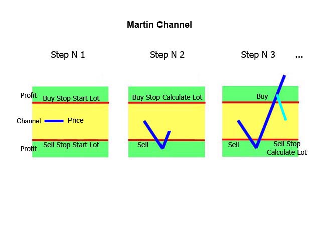 The EA places two pending BUYSTOP and SELLSTOP orders at a specified distance from the price with a specified take profit. After the first order is opened, the EA places an opposite order mathematically calculates the volume of the opposite order to take the specified profit value, with consideration of the specified price channel.