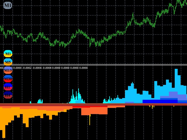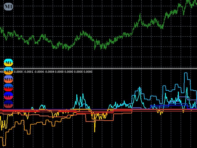 To improve the indicator readability, lowering coefficients are applied to the higher timeframes so that the lower graphs remain dominant.