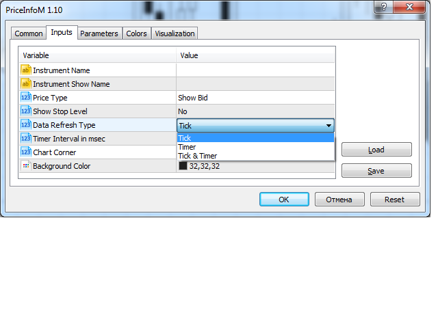 - Data Refresh Type - mode of updating the information on the screen. The following modes are available - Tick / Timer / Tick & Timer. In Tick & Timer mode the information is updated at every tick of the instrument and according to a set time interval.