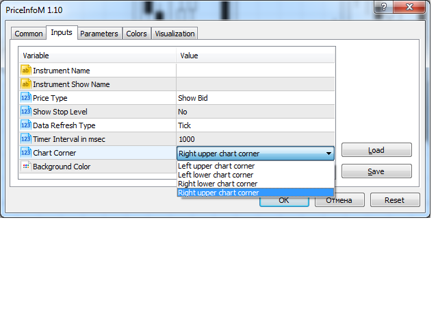 - Instrument Name - name of the instrument to be displayed. If this field is left empty, the chart instrument will be used. The instrument displayed can differ from the one of the current chart. For example, you can view GBPUSD parameters on EURUSD chart.