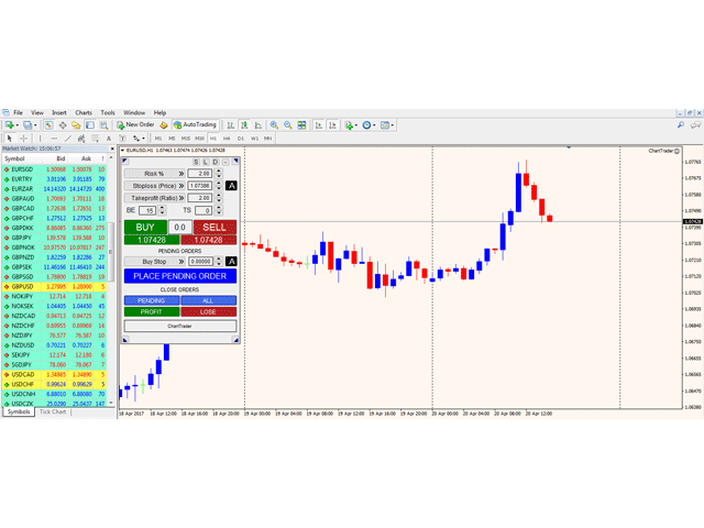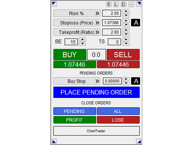 ChartTrader offers a number of options to make placing orders in the Forex market quick and easy. The GUI sits on the chart window so there is no need to navigate to separate windows when placing orders. The program allows you to set pending and instant orders. It has a built in risk management system, so every trade can risk a percentage or a fixed amount in currency so there is no need to perform any calculations saving you heaps of time.