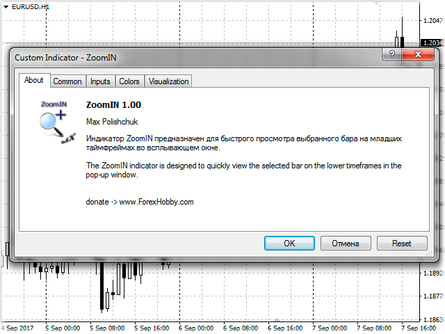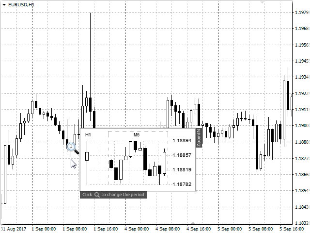 The ZoomIN indicator is designed for quickly viewing the selected bar on the smaller timeframes in a pop-up window.