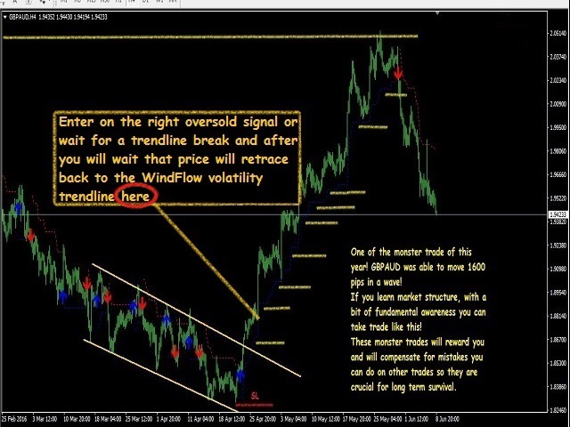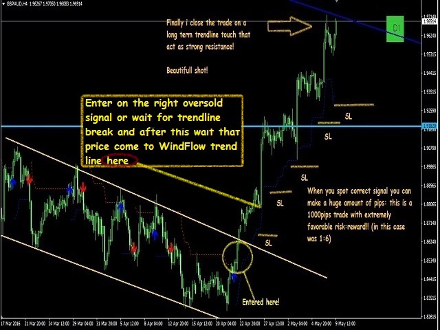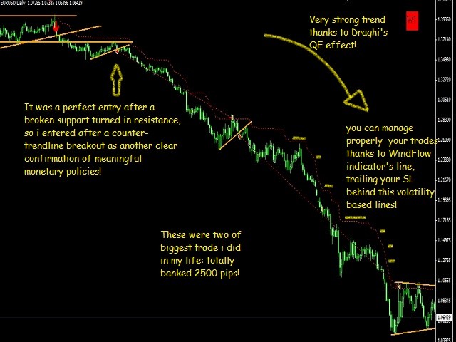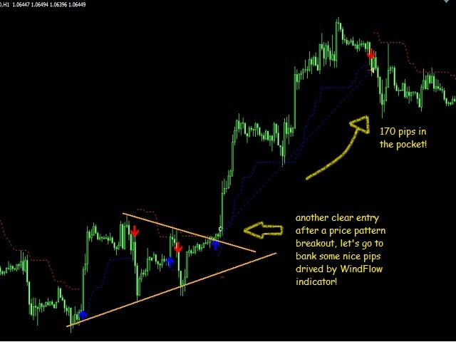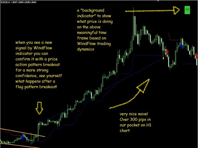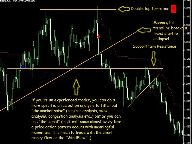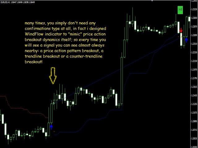 WindFlow is the perfect tool to have a very clear picture about the recent market dynamics, this because it is based on dynamic's concepts itself just like the wind is dynamic. When you see a new signal it is the time to take some action; if you are an experienced trader you can confirm this signal with your own analysis; if you are a newbie in the trading world you have found a great friend in this tool, i suggest to confirm the signals just looking at the higher time frame's waves formation (higher high-lower high for uptrend for example) and doing a simple support and resistance analysis. Often you will find that market is ranging on higher TF (you will spot this by sup/res analysis), in this case you can easily switch to lower timeframe as M5 or M15 and start to trade near the support and resistance only (that you have spot on higher TF) thanks to WindFlow's indications, in this way you will have great winratio% and your drawdown will be very low. So make sure to spot the correct market type if it is trending or ranging just like the professional traders are doing! As you can see I'm sharing a great and useful tool here that help me every day in my trading activity, you can do also very well in trading but it is all up to you; so if trading is you real passion i give you the sureness that you can succeed as a trader.