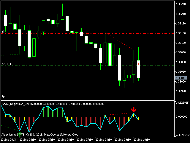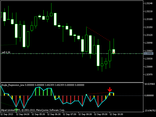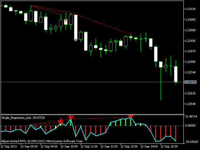 The indicator allows determining the strength and direction of the trend precisely. The histogram displayed in a separate window shows changes of the slope of the regression line. A signal for entering a deal is crossing the zero line and/or a divergence. The indicator is also useful for wave analysis.