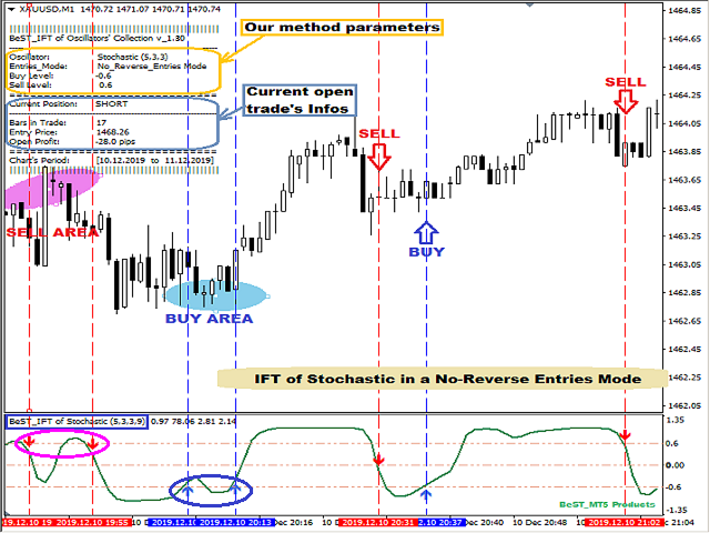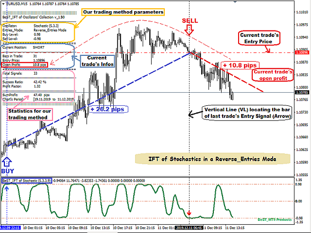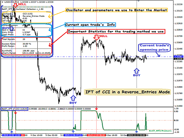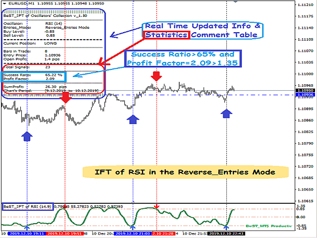 - for Reverse_Entries Mode we get a Real Time Updated Info and Statistics Comment Table and so we can have some very useful info about the current open trade (Entry Price,Number of Bars in trade,Open Profit in pips) but also some very important statistics like% Success Ratio and Profit Factor for the corresponding Oscillator Type, its parameters, Buy and Sell Levels Value and always for the Current Chart Symbol, Time Period and Timeframe (for example getting a Success Ratio >=65% and Profit Factor>1.30+ we can have a better possibility for the next trade to be profitable!).