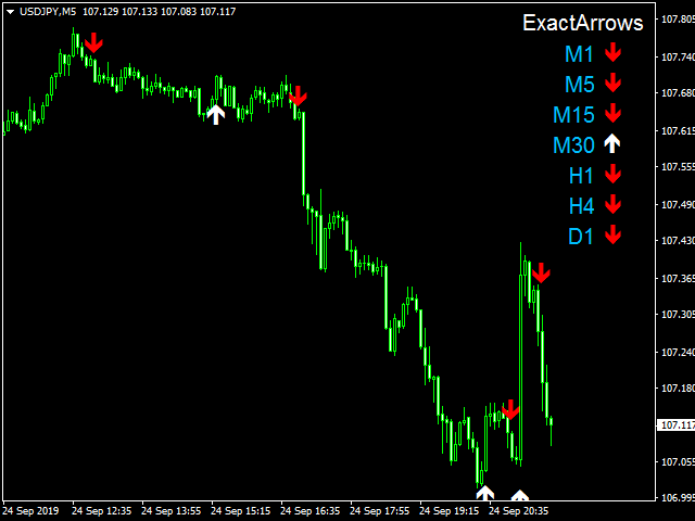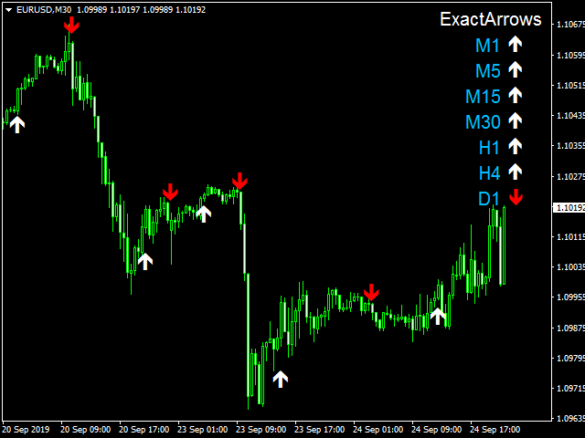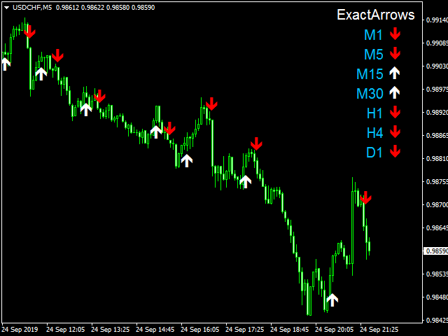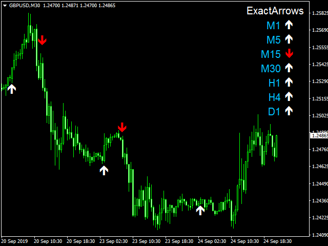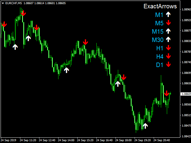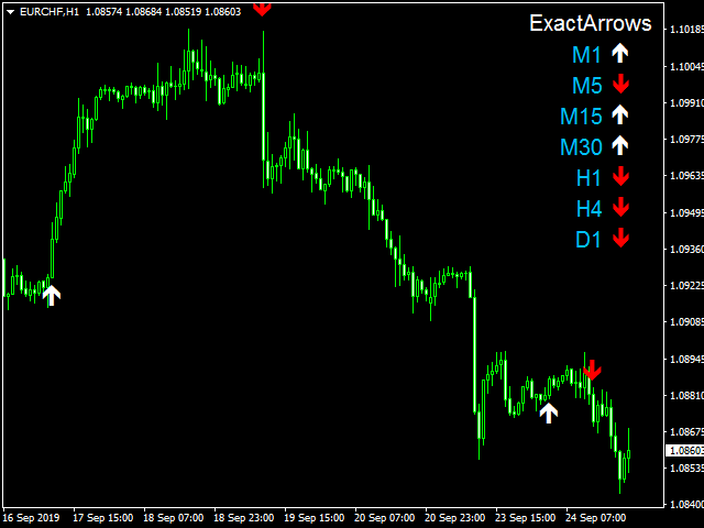 The main aim of this indicator lies in determining entry and exit points, that is why the ExactArrow indicator does not draw nothing but arrows which show entry and exit points.
