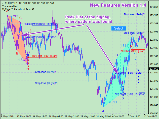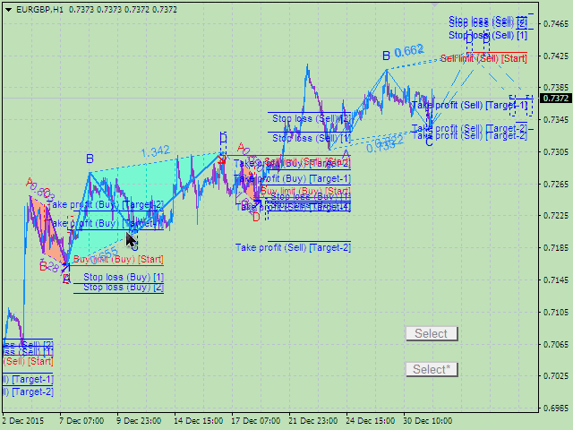 The indicator scans all possible combinations on the chart for the current moment, and also in history, with the help of specifically designed tracing algorithm. If a pattern is not formed yet, the indicator plots a possible (predicted) ABCD pattern. Once the price reaches the D vertex of the predicted pattern, it becomes fully formed. Thus, all the ABCD patterns, as well as their possible variants, that meet the parameters specified in the settings, will be highlighted.