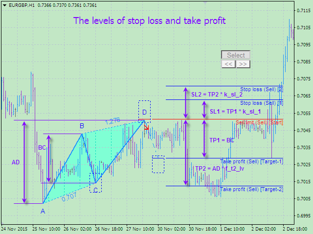 - f_t2_lv – second target level (Fibonacci level of the entire movement of the AD pattern) (0.786)