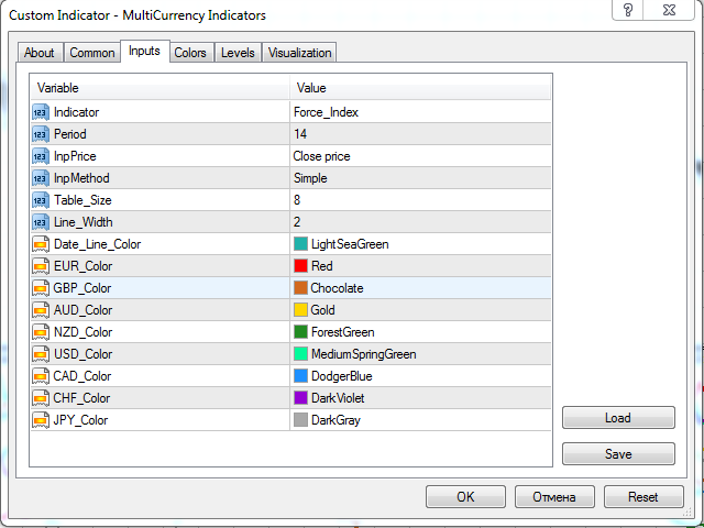 - Calculation is performed for 8 virtual charts of the currencies: EUR, GBP, AUD, NZD, USD, CAD, CHF, JPY;