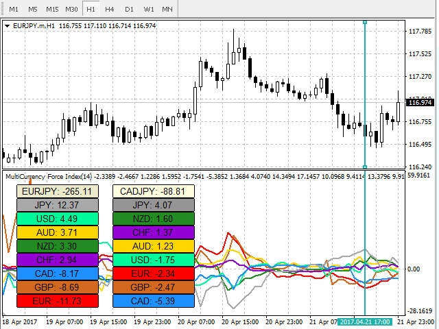 The Force Index values in the columns are sorted in descending order from top to bottom, that is, the order of the currencies corresponds to the order of the lines on the chart. Also, the appropriate value of the Force Index on the chart is indicated in the column next to each currency.