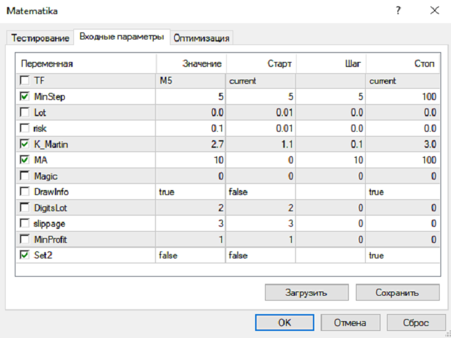 TF-timeframe蜡烛图确定趋势的方向,以分钟为单位1 5 15 30 60 240。..MinStep-订单之间的最小步长(在终端与5和3位数的报价增加10倍)Lot-lot if=0,则该手数将按风险的可用保证金百分比计算 %风险-可用资金的百分比K_Martin-后续批次的乘法(可以设置为1禁用批次的增加,而不是加载存款)MA-按MA过滤(如果价格高于MA,则只购买,反之亦然0-禁用过滤器)魔术-独特的顾问的订单数量DrawInfo-在屏幕上显示信息DigitsLot-舍入顺序手1-十分之一(0.1)2百分之(0.01)滑点-滑点MinProfit-关闭所有平均订单的最低利润点Set2-如果为true,则立即下单,没有信号,如果为false,则等待蜡烛线收于上方/下方Установите приложение на смартфон и работайте офлайн+Установить Переводчик