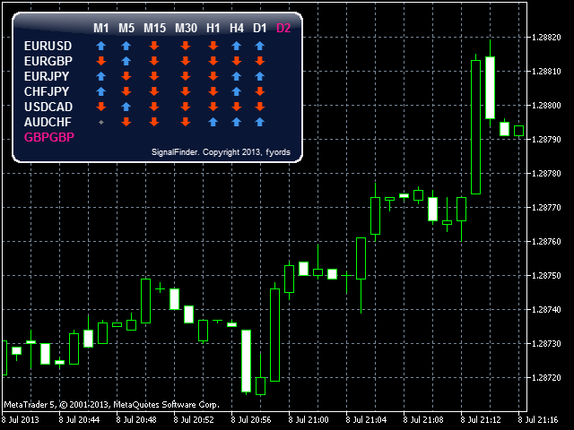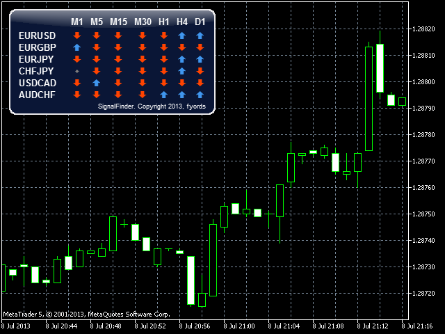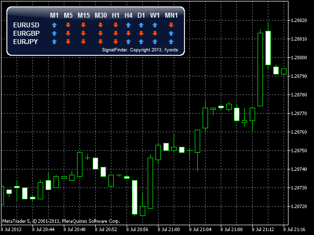 SignalFinder is a multicurrency indicator displaying trend direction for several currency pairs and time frames on a single chart.