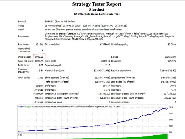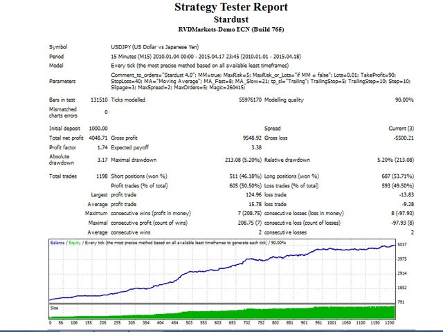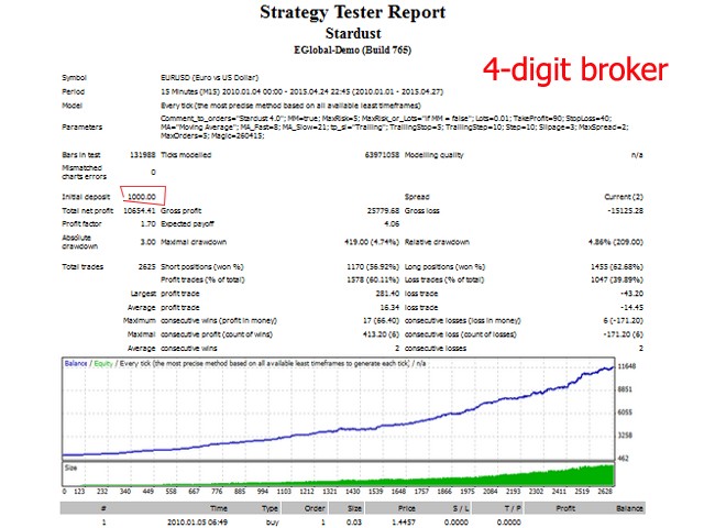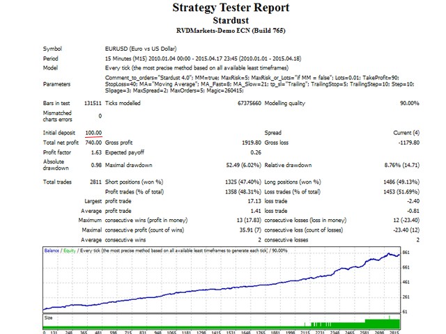 StarDust searches for divergences in the values of several indicators considering them as signs of flat and enters the market if a relatively steady trend is detected. The Expert Advisor trades "basic" symbols with a low spread. The best results are achieved on М15.