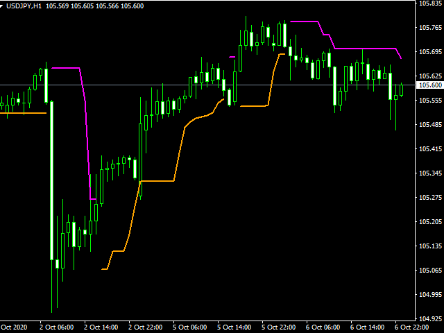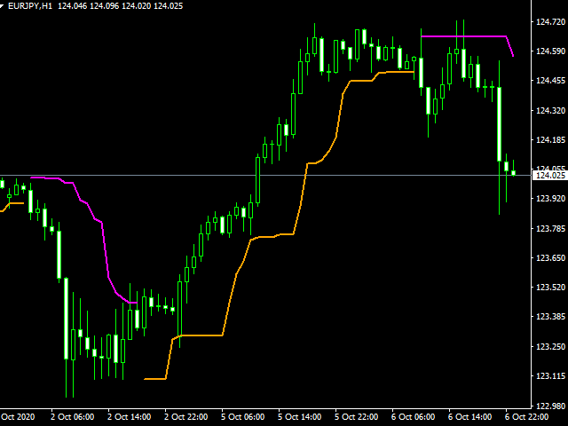 The Candle High Low Exit indicator uses the highest high and the lowest low of a range to draw trailing stop lines (orange under buys, magenta over sells) that advance with the trend until the trend changes direction. Moreover, the trailing stop lines are generated to support the order’s trend direction (long or short):