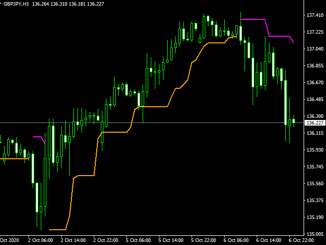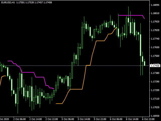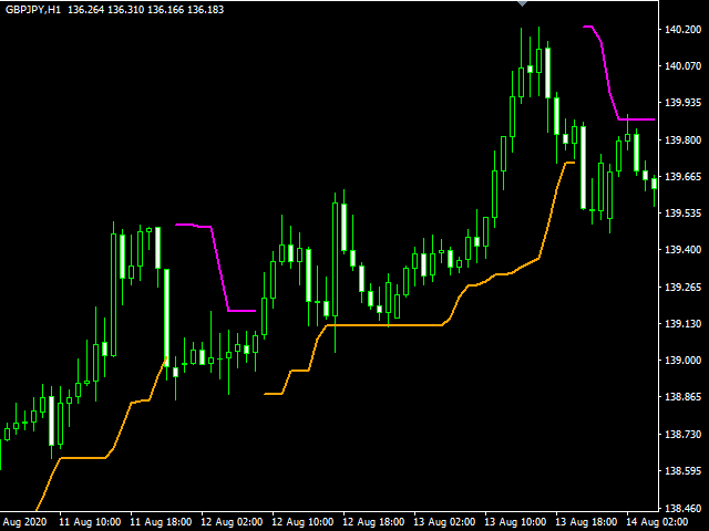 - Show Channel (true/false) — if false (default), it shows the orange line under buy in upward trend, magenta line over sell in downward trend; if true, it shows a channel on both sides of the price.