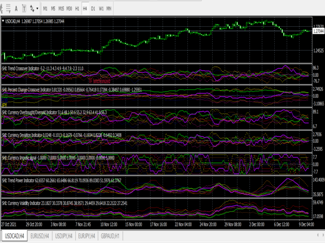 The main advantage of this indicator is that it's reasoning by currency and not by currency pair. The values of each sub-indicator are calculated for the 8 major currencies: USD, EUR, JPY, GBP, CAD, AUD, CHF, NZD.