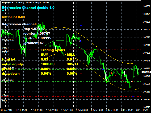 Trading robot for a real account. It is a continuation of the idea used as the basis of the popular Regression Channel EA. Unlike its predecessor, it uses a bidirectional trading algorithm. The robot trades inside a channel formed by regression curves. Deals are always by stop losses.
