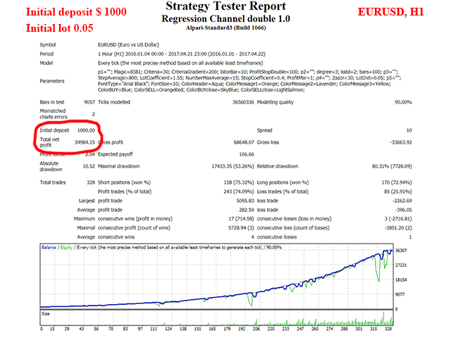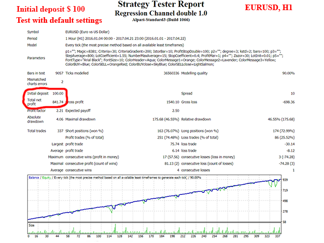 The default parameters are optimized to trade with the minimal risk on EURUSD H1. The EA was tested with the default parameters using real ticks. Testing results: starting with the initial deposit of $100 on EURUSD H1, the robot earned $840 from 01/01/16 to 21/04/17, net profit for 15 months of trading comprised 840%; with the initial deposit of $1000 and initial lot increased to 0.05 it earned $8000, net profit comprised 800%.
