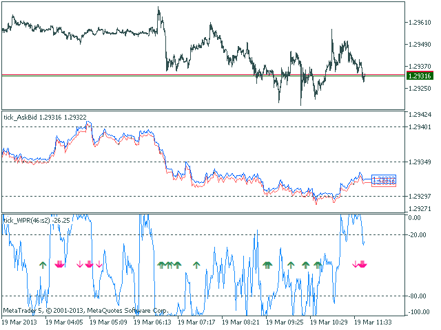 The Williams' Percent Range (%R) indicator drawn using a tick chart. After launching it, wait for enough ticks to come.