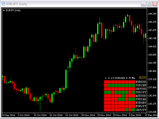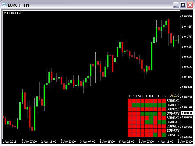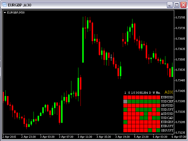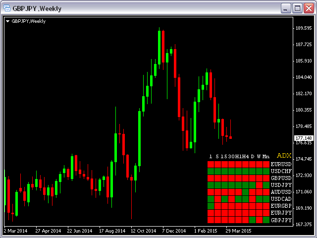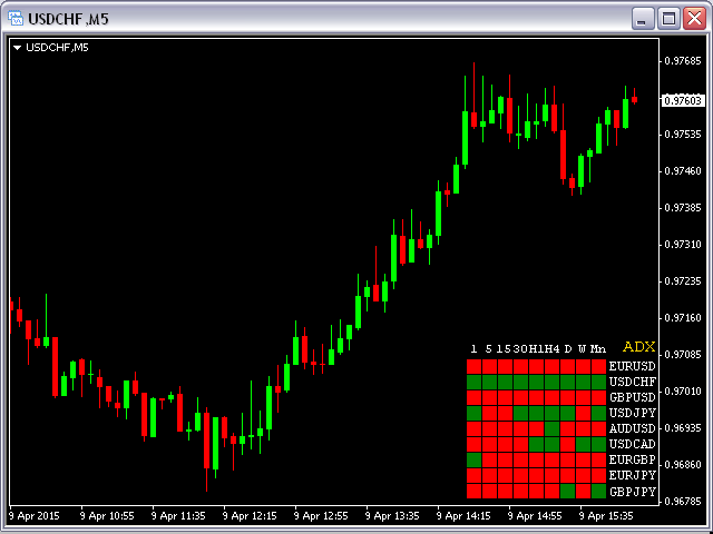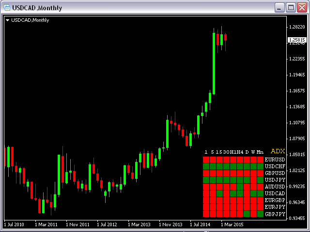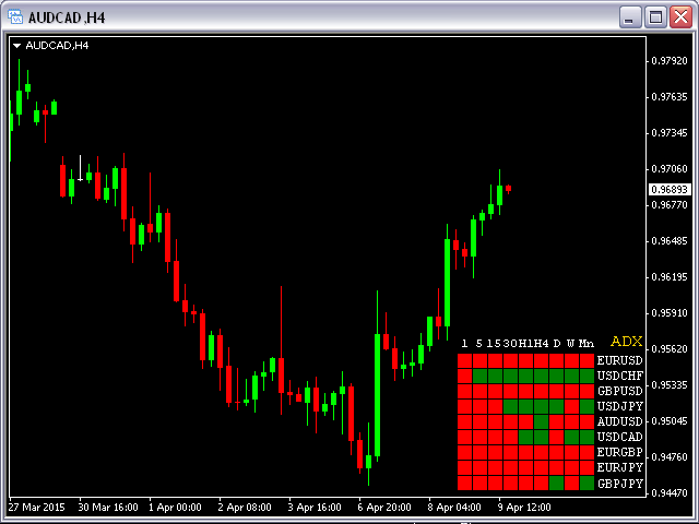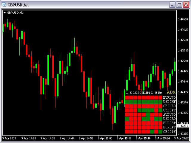 This indicator shows ADX data from 9 currency pairs by your choice for all 9 Time Frames.