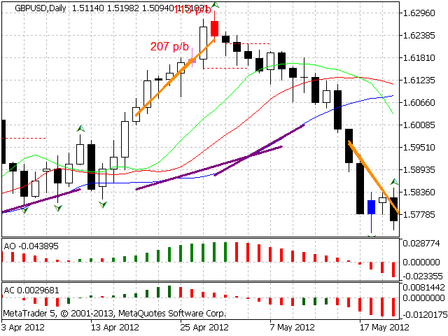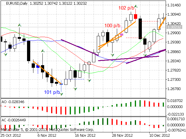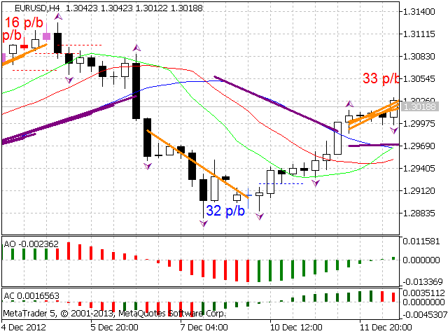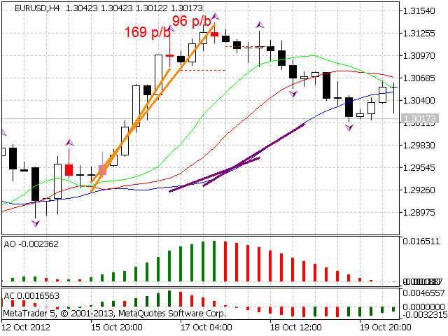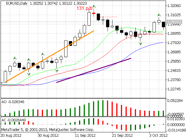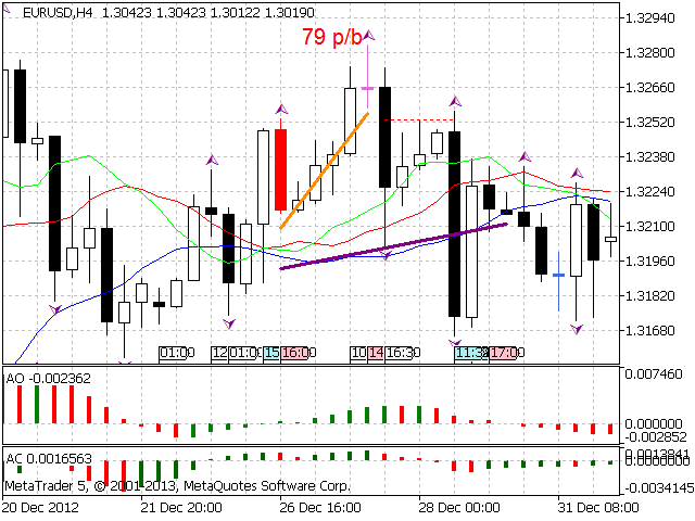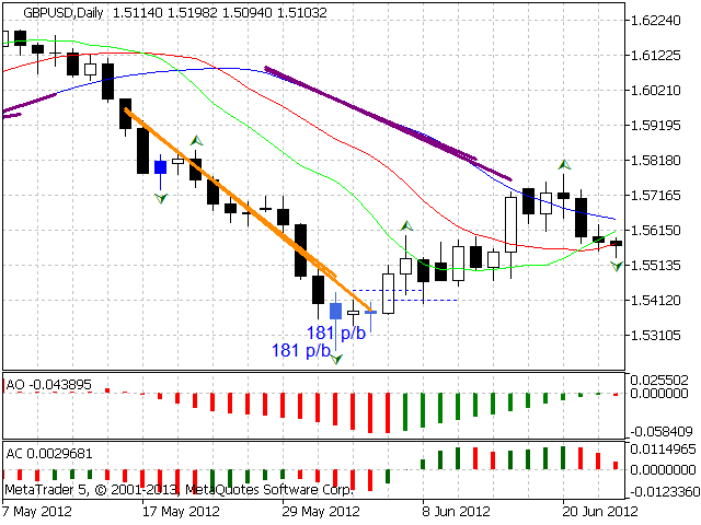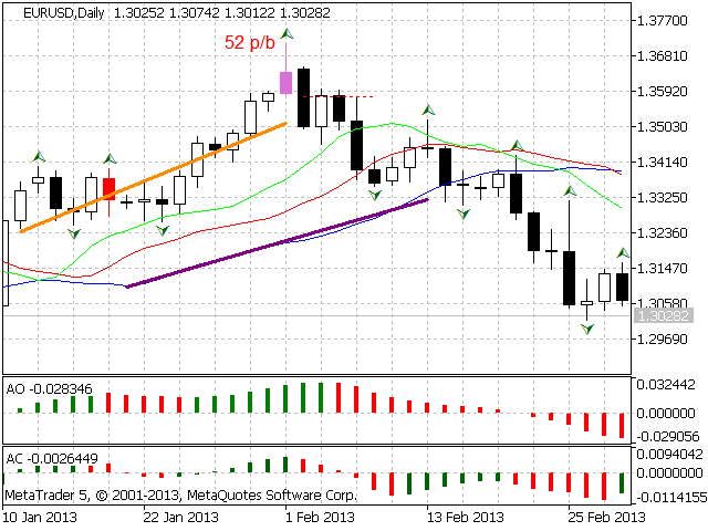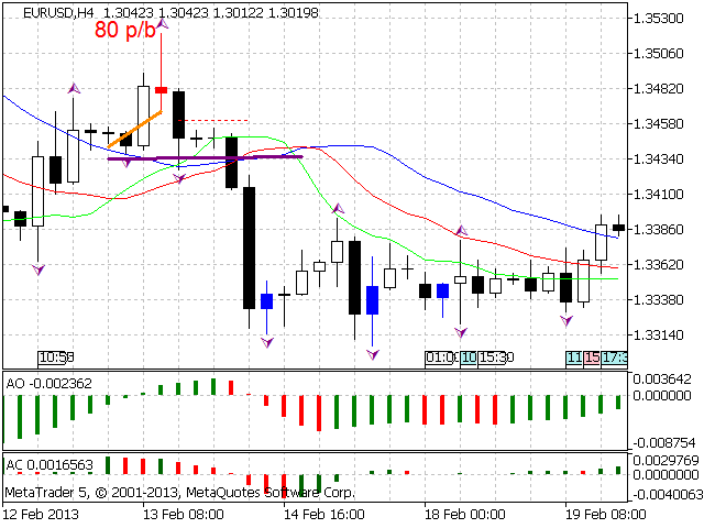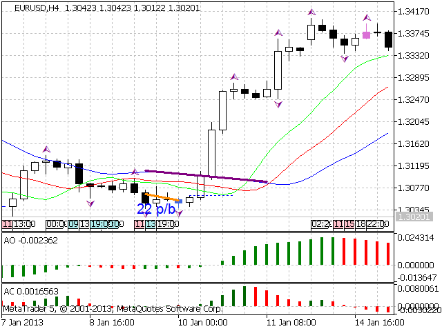 According to Bill Williams' trading strategy described in the book "Trading Chaos: Maximize Profits with Proven Technical Techniques" the indicator displays the following items in a price chart: