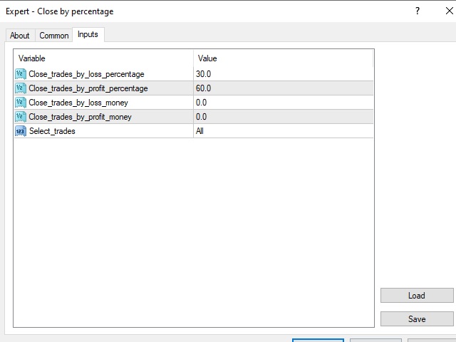 - " Close_trades_by_loss_percentage " - percentage of floating loss from the balance at which positions are closed; at 0 the function is not active.