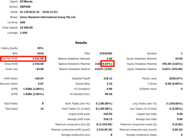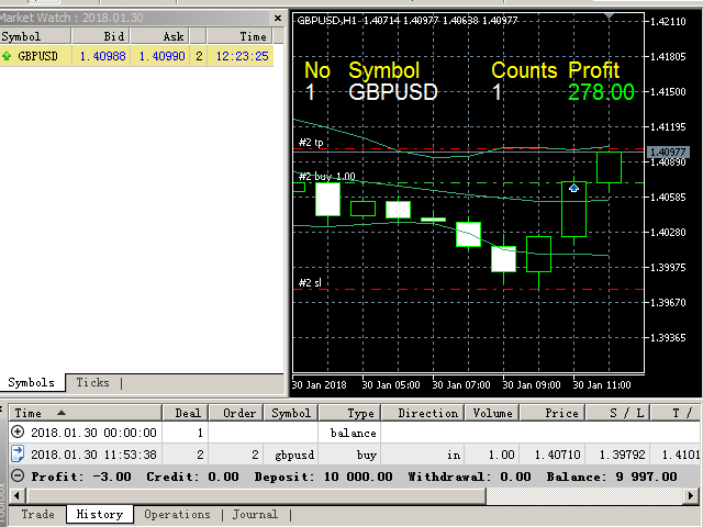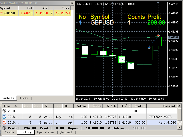 DYJBands使用Bands带信号开仓关仓:当价格回落时,它在较低频段买进,而在较高频段卖出.在相反的信号下或通过止盈,止损,追踪止损关仓. 这个专家使用了资金管理,传统的止损,止盈,追踪止损.每次交易限定的订单数量,这确保交易的最大安全.EA不使用高风险的交易方法,并且可以在大多数货币对和时间范围内进行交易.此外,它不会花费太多,而且它的设置非常简单,这对有经验的和新手交易者都是有好处的.EA默认设置参数设置适合GBPUSD在图表周期H1运行.此外, EURUSD, USDJPY, USDCAD和XAUUSD或其他等货币对的设置将在评论部分提供.