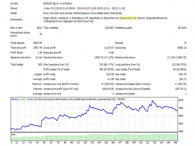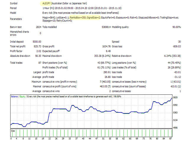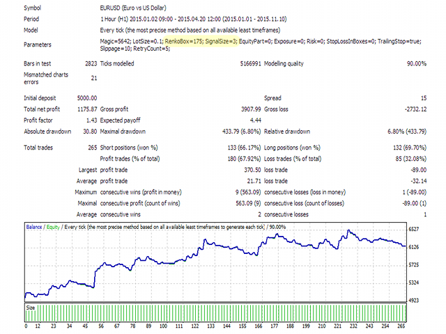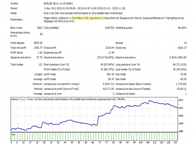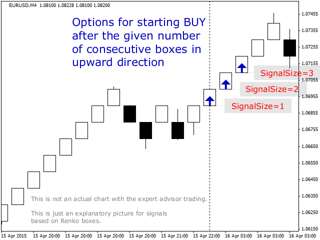 The Expert Advisor forms a virtual representation of Renko chart (no indicators used) and then trades on predefined formations of Renko boxes. An order is opened when a predefined number ( SignalSize ) of unidirectional Renko bars are formed after reversal.