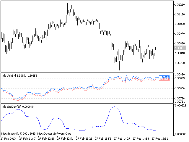 The Standard Deviation (StdDev) indicator drawn using a tick chart.