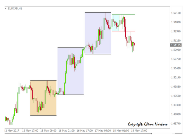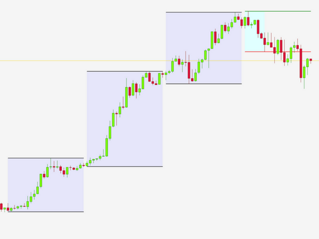 - ShowLOB – images (if TRUE, there is a visual display of three previous days and the current day price action. Three previous days are shown in boxes of different colors depending on whether they were up or down days. The current day price action shows two sets of lines. The red line indicates low price during Tokyo session and the green line indicates the highest price during the Tokyo session. Objects are displayed only on PERIOD_H1 and PERIOD_M15).