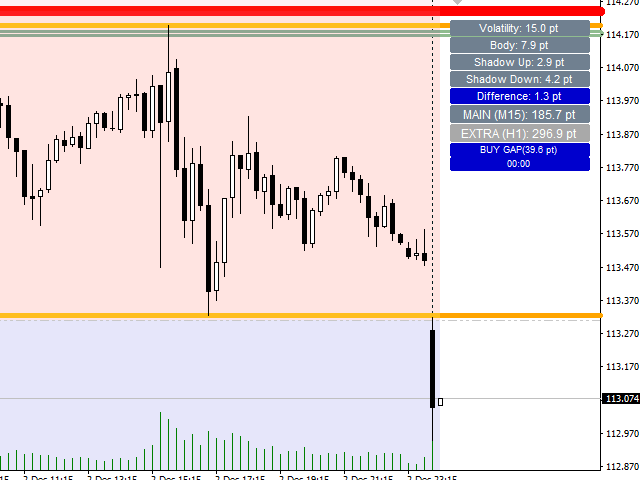 - output of the information about the current market situation (average volatility, size of the candle body, its upper/lower wick and their difference, which indicates the probable direction of the price using colors: Bullish - blue, Bearish - red)