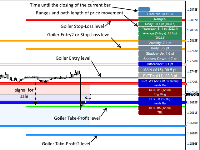 - The Goiler levels show the probability of trade direction: if the light green line is above the dark gray line, it is a buy signal, if lower — sell signal. Light green - take profit, blue - take profit 2, red - stop loss, orange - either stop loss or (depending on the market situation) the market entry point.