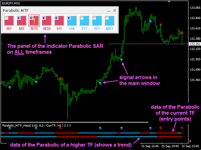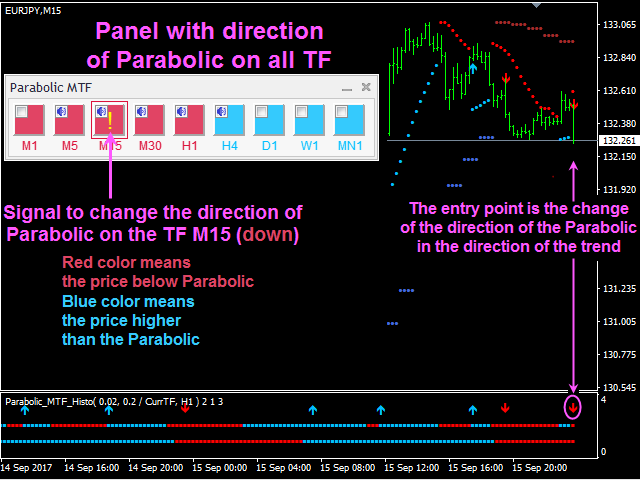 - Sorting out most flat movements - a signal is provided only if the directions of Parabolics from two timeframes coincide.