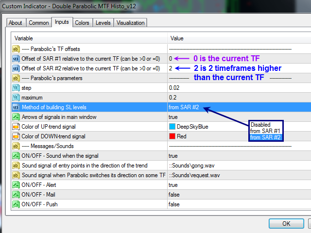 - Offset of SAR #2 relative to the current TF (can be >0 or =0) - shift of the Parabolic 2 timeframe (by default, 2 - 2 timeframes higher than the current one)