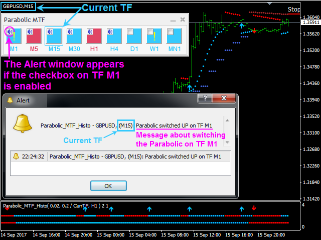 (needed for EAs based on Double Parabolic MTF Histo).- Information on a signal is displayed in a message box with an audio alert. It also supports sending messages to email and push-messages to mobile devices.