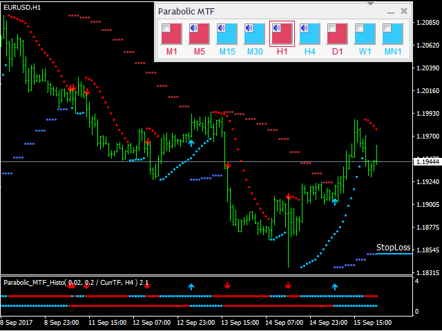 Double Parabolic MTF Histo implements this idea and combines two timeframes on a single Parabolic chart. The higher timeframe Parabolic defines the trend, while the lower timeframe one searches for the market entry point in trend direction.