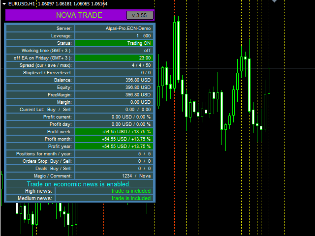 The Expert Advisor uses 3 different strategies based on news fluctuations. The EA downloads the news from economic sites. The EA takes into account only HIGH and MEDIUM impact news and trades on their basis. The EA uses a smart profit taking system.