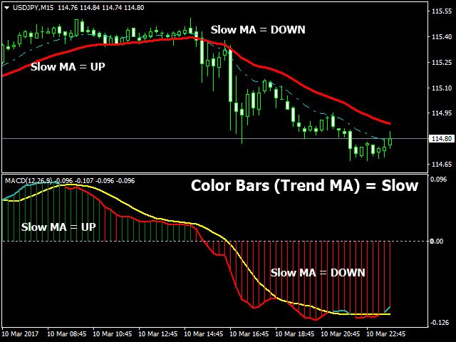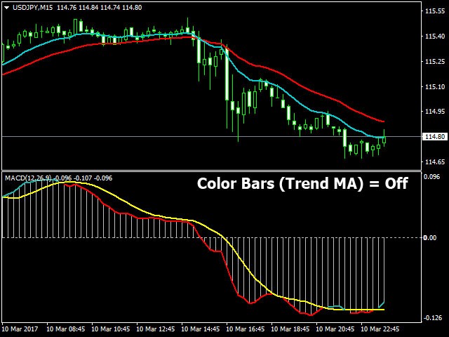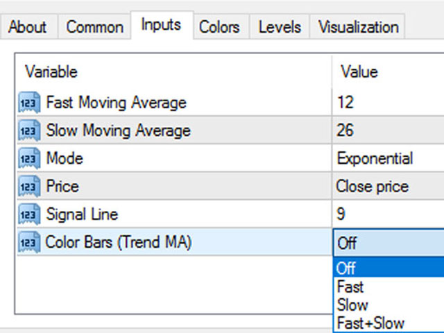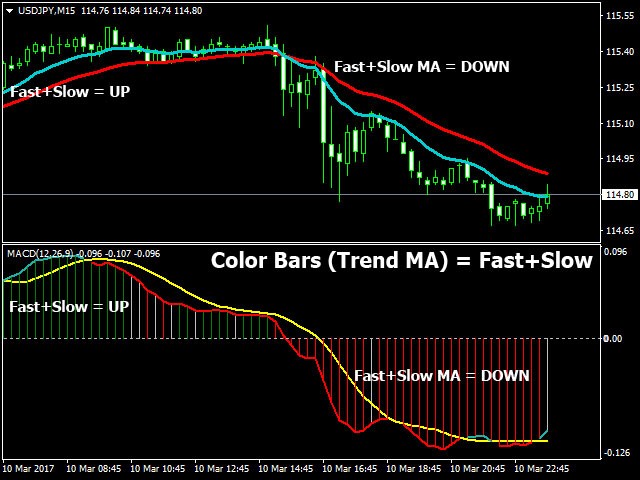- Color Bars (Trend MA) – change the color of the indicator bars when changing Fast and (or) Slow Moving Average slope angles.