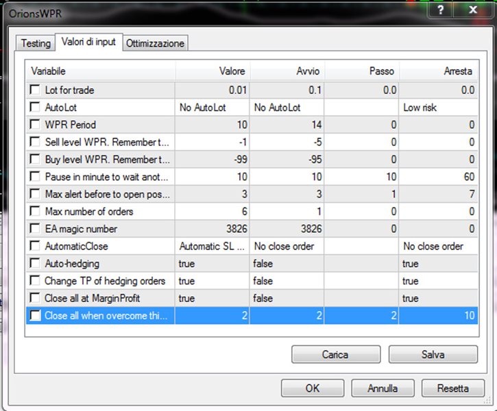 3) "Breakeven and WPR inversion", "Auto-Hedging" FALSE, "Close all" TRUE : The EA closes if the sum of order profit reach the target set in "Close all when overcome this amount" . This configuration is a hedging solution at low risk and low profit.