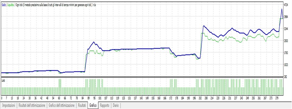 6) "Automatic SL e Extra profit", "Auto-Hedging" FALSE, "Close all" TRUE : With this configuration, the order are opened with TP equal to half daily volatiity. If the price is close TP, the EA sets the SL at breakeven. Also the TP is moved when the price is near at him. Ther isn't double hedging. Low risk, but operativity is very slow in opposite trend market.