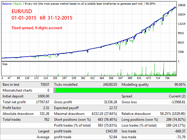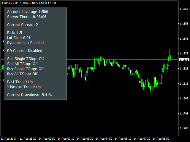 This is a fully automated Expert Advisor that does not require stopping during the news release. Trade is conducted by the trend determined by the indicator Ichimoku. Opening the orders occurs near the support (resistance) levels and in presence of the confirmation signals from other indicators.