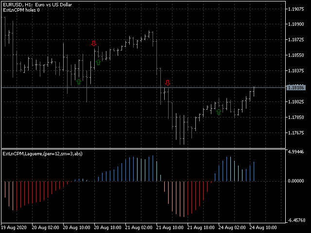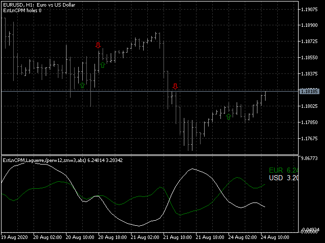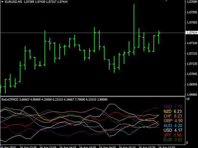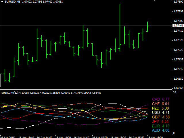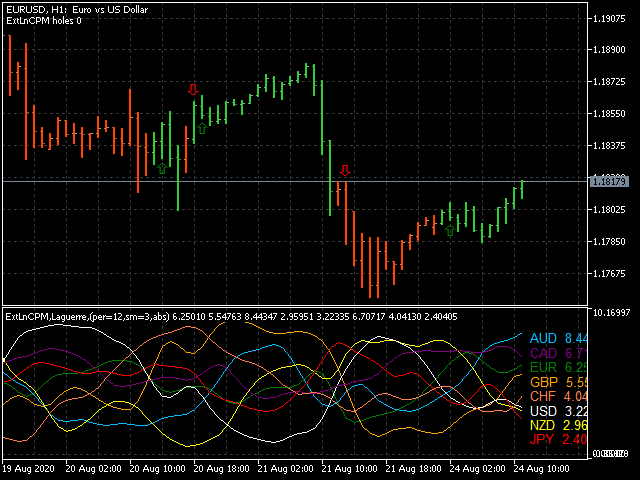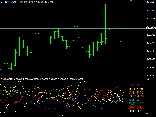 该指标将数据显示为所有货币的线条或当前货币对的直方图。当前货币对的货币强度指数的交集在图表上额外显示为箭头。当前趋势方向由条形图的颜色突出显示。