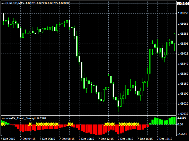 The indicator displays trend strength, including showing the transition from buy to sell and visa versa. It is ideal for trend following strategies and also highlights possible reversals/flattening trend with a yellow X on the indicator window. By default, the indicator does not repaint/flicker, however, there is an option to calculate on the live candle but even then the indicator will not repaint unduly. The indicator can also be used for exit.