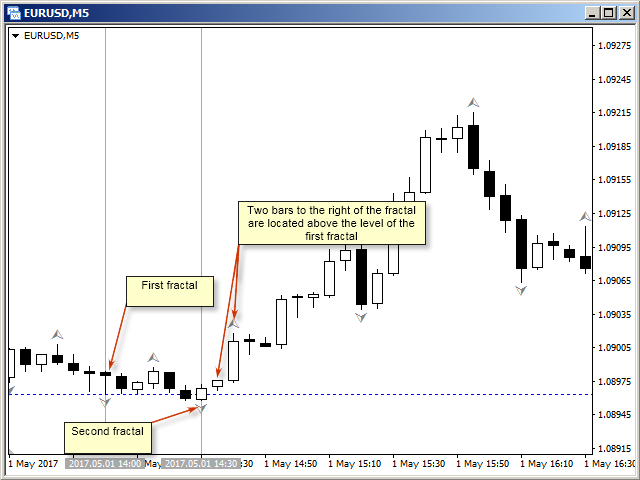 A bullish fractal divergence is a combination of two lower fractals, the last of which is located below the previous one, and, at the same time, two candles to the right of the Low of the last fractal have Lows higher than the previous fractal level (see screenshot 1).
