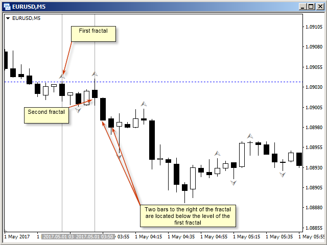A bearish fractal divergence is a combination of two adjacent upper fractals, the last of which is located above the previous one, but, at the same time, two candles to the right of the top of the last fractal have Highs lower than the first fractal level (see screenshot 2).