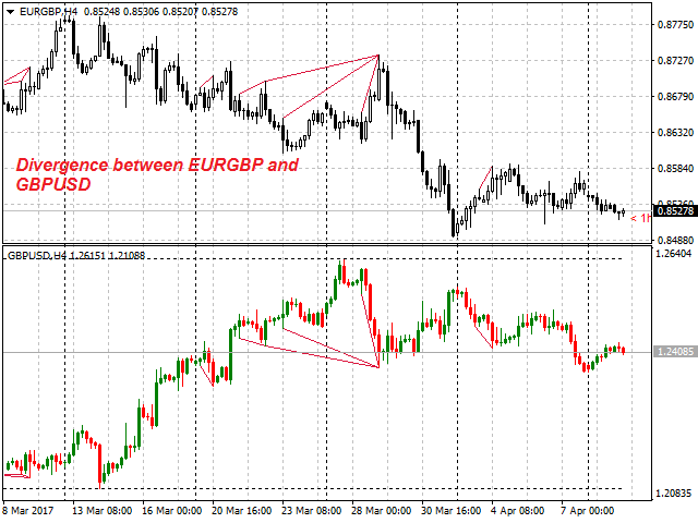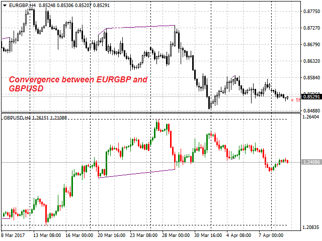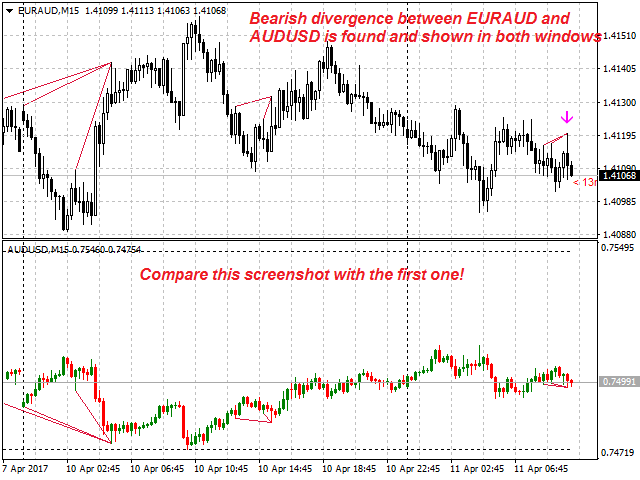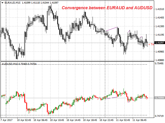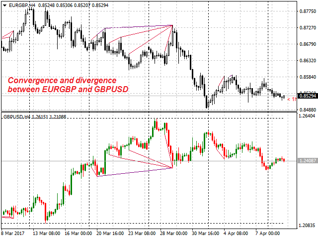 The indicator is not a lagging one. It works by ticks and is able to show convergence/divergence in the symbol's window even if there is no a separate window with a different financial instrument used for search. This allows you to open additional windows with any other indicators for a joint analysis.