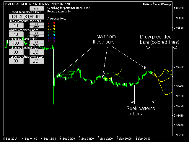 - Seek patterns for bars - length of the selected interval in bars, which is used to search for matches (patterns).